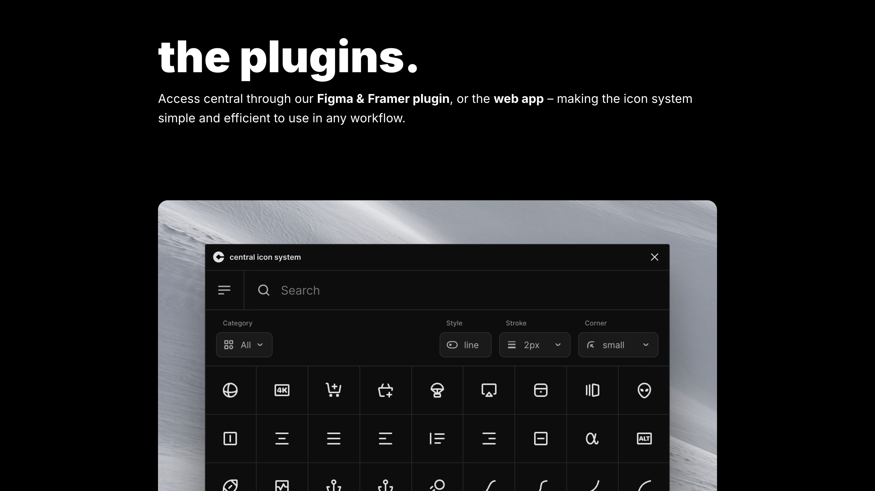 The central icon system was designed to be as universally applicable as possible and utilizes Figma variants and properties to offer a completely customizable icon set.