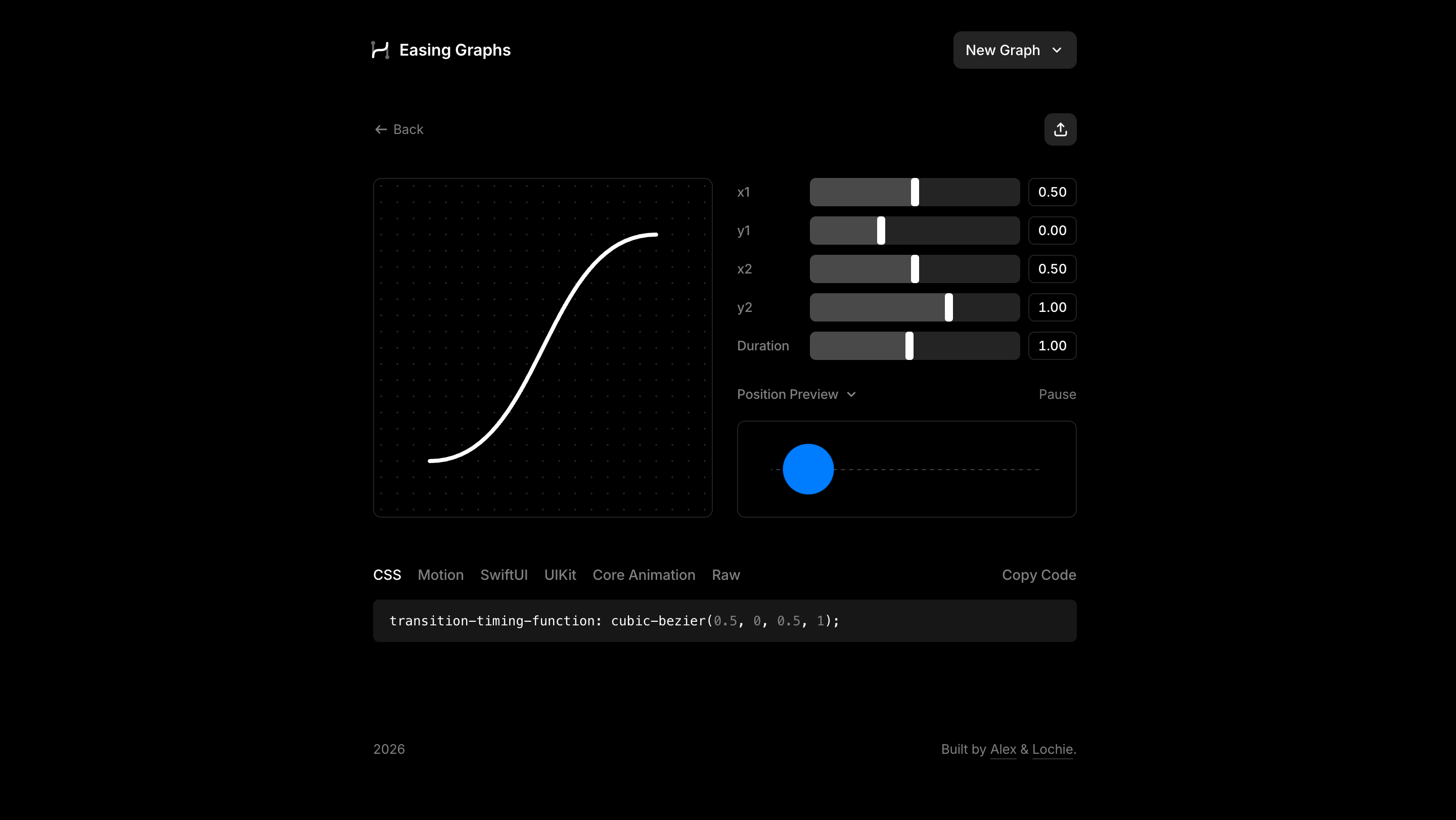 A visual library of animation curves with real-time preview. Browse preset cubic and spring easings, customize control points, and export code for CSS, SwiftUI, UIKit, and more. Built by Alex & Lochie.