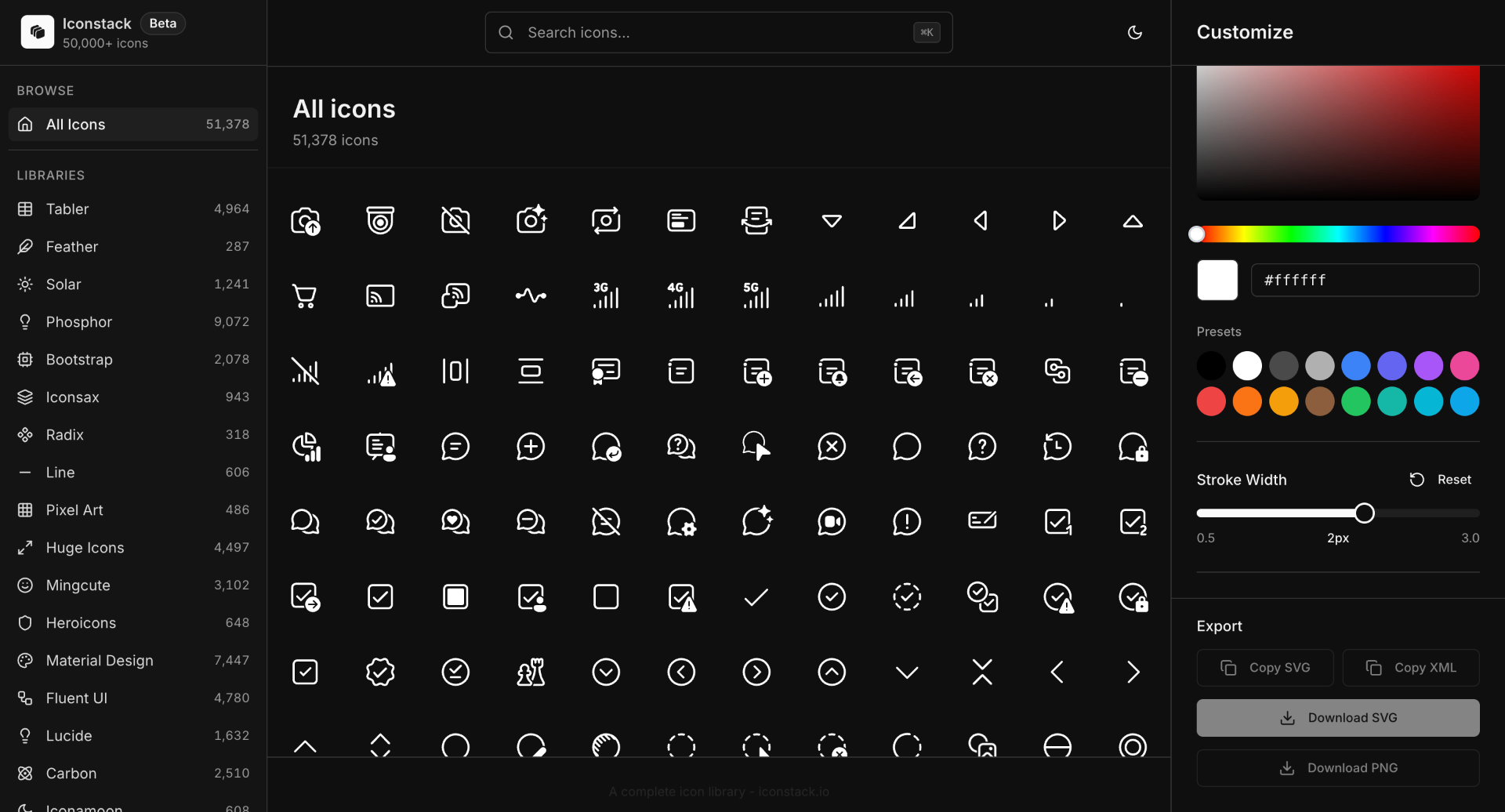 Search across libraries in one place and export any icon instantly as SVG. Iconstack offers 50,000+ open-source icons in three styles — outline, solid, and mixed — all free to use in your designs