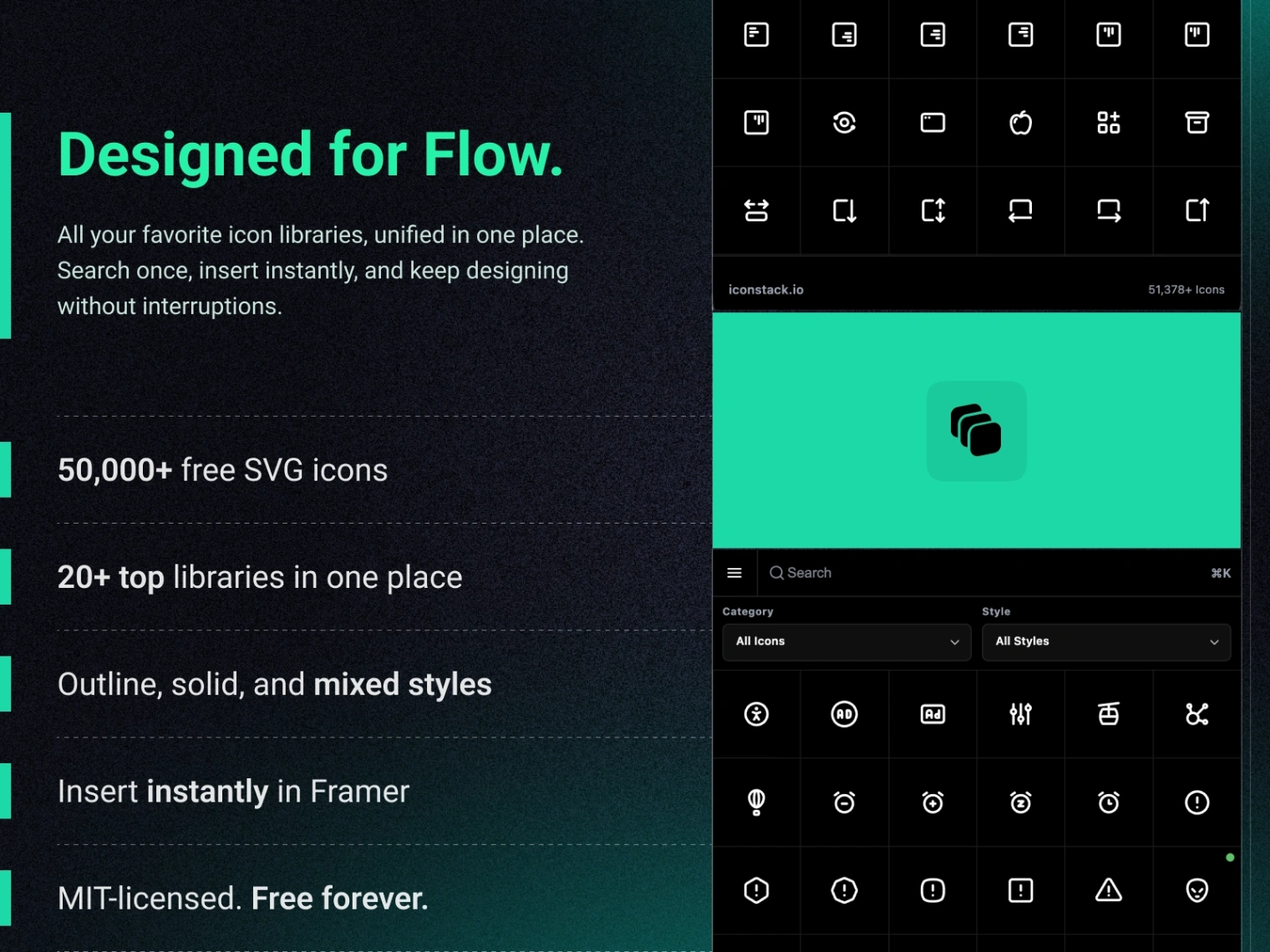 Iconstack brings 50,000+ free, open-source, MIT-licensed SVG icons from the most popular libraries — including Material Design, Tabler, Phosphor, Lucide, Remix, Bootstrap, Ant Design, Atlas, Line Icons, Pixelart, Teeny Icons, BoxIcons, CSS.gg, Iconsax, Fluent UI, IconNoir, Ikonate, Octicons, Radix Icons, and Solar — directly into Figma.