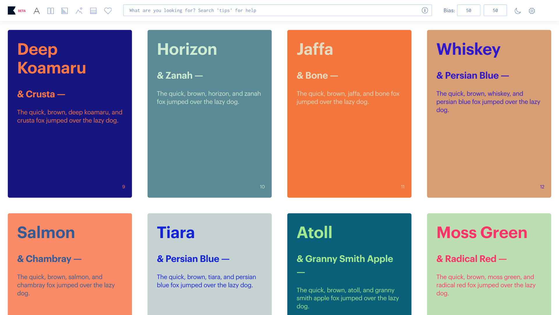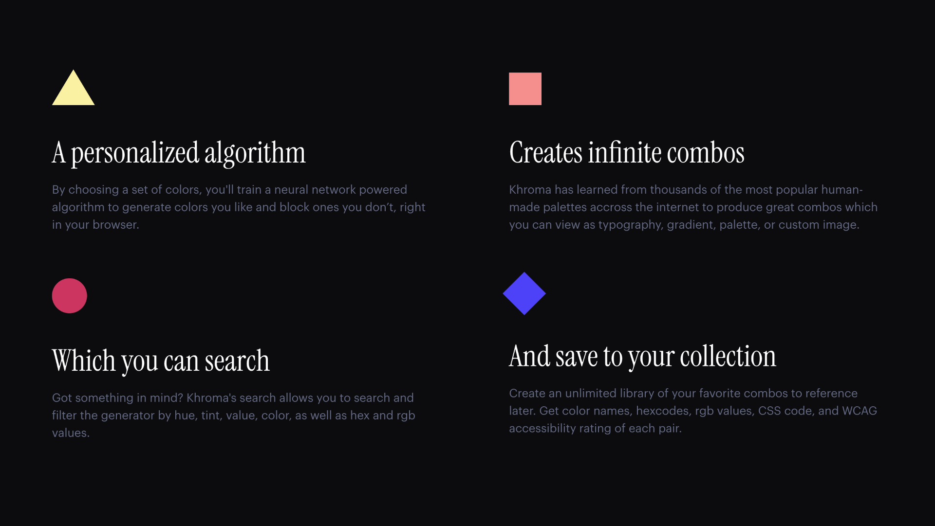 Khroma uses AI to learn which colors you like and creates limitless palettes for you to discover, search, and save.