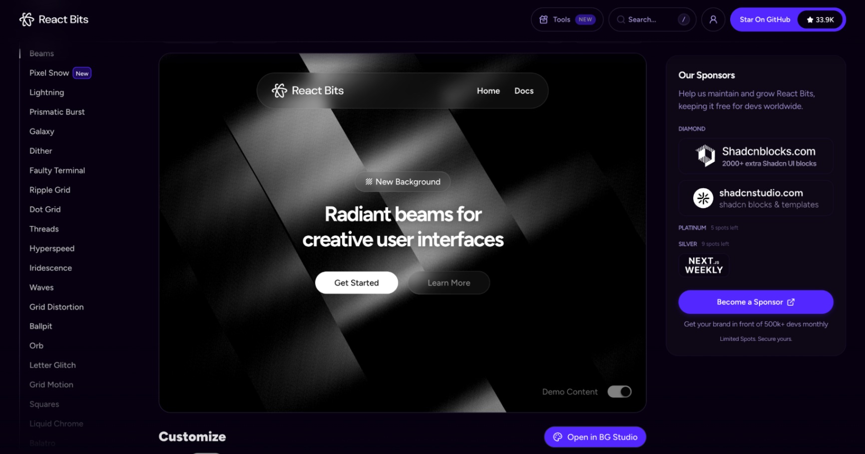 The goal: components that make people go "wow." Over 30K GitHub stars and 110+ components, built as a side project by David Haz, a frontend engineer with six years of experience who pours his free time into what he calls "statement pieces." Text animations, animated backgrounds, interactive cursors, WebGL effects. Things you'd spend hours implementing from scratch, packaged as copy-paste components with obsessive customization options. Every component ships in four variants (JS/TS × CSS/Tailwind) so you're never locked into a stack you don't use. David named it "Bits" specifically so he wouldn't be constrained by a single style. That freedom shows.